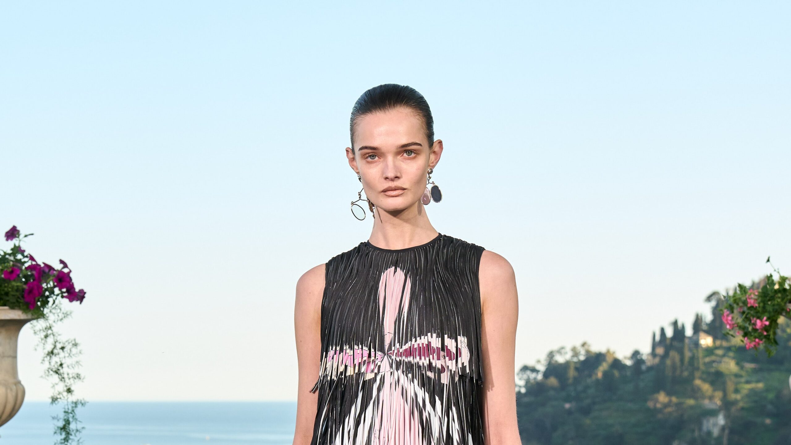 Pucci visuals, typically overwhelmingly dense, are getting a contemporary, kinetic spin below Miceli. For spring, she zeroed in on the Marmo motif, “the primary print that seduced me,” she stated. Initially conceived by Emilio Pucci when he discovered himself mesmerized by the sunlit ripples inside Capri’s Grotta Azzurra, the swirling sample carries a hypnotic, virtually hallucinatory rhythm. Miceli wove it via the gathering—reimagined in prints; picked out with metallic studs on tunics and palazzo pants; and remodeled into beaded black-and-white swirls, shiny as seashells.