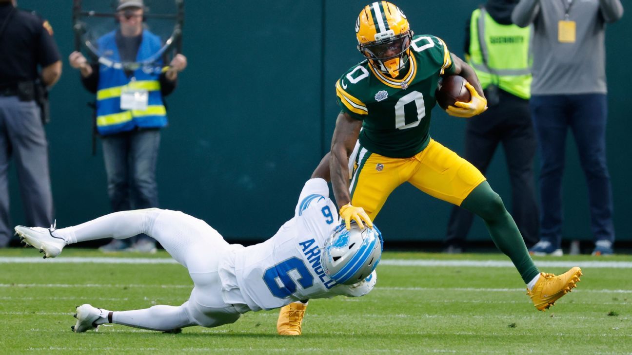Fantasy scoop: The Packers’ comfy Week 1 victory stored their go performs to a minimal (26 dropbacks), however we did get a have a look at the staff’s new-look WR room. Romeo Doubs (16 routes, 4 targets), Matthew Golden (13 routes, two targets), Dontayvion Wicks (9 routes, two targets), Jayden Reed (12 routes, 5 targets), Malik Heath (three routes, zero targets) and Savion Williams (one route, one goal) have been all concerned. This deployment paints the image of a large receiver-by-committee method, nevertheless it’s very attainable Golden was restricted a bit in his professional debut. The primary-round rookie’s position figures to extend because the season progresses, and the targets will comply with in additional aggressive, pass-friendly video games. Within the meantime, Golden, Reed and Doubs are not more than fringe flex choices.