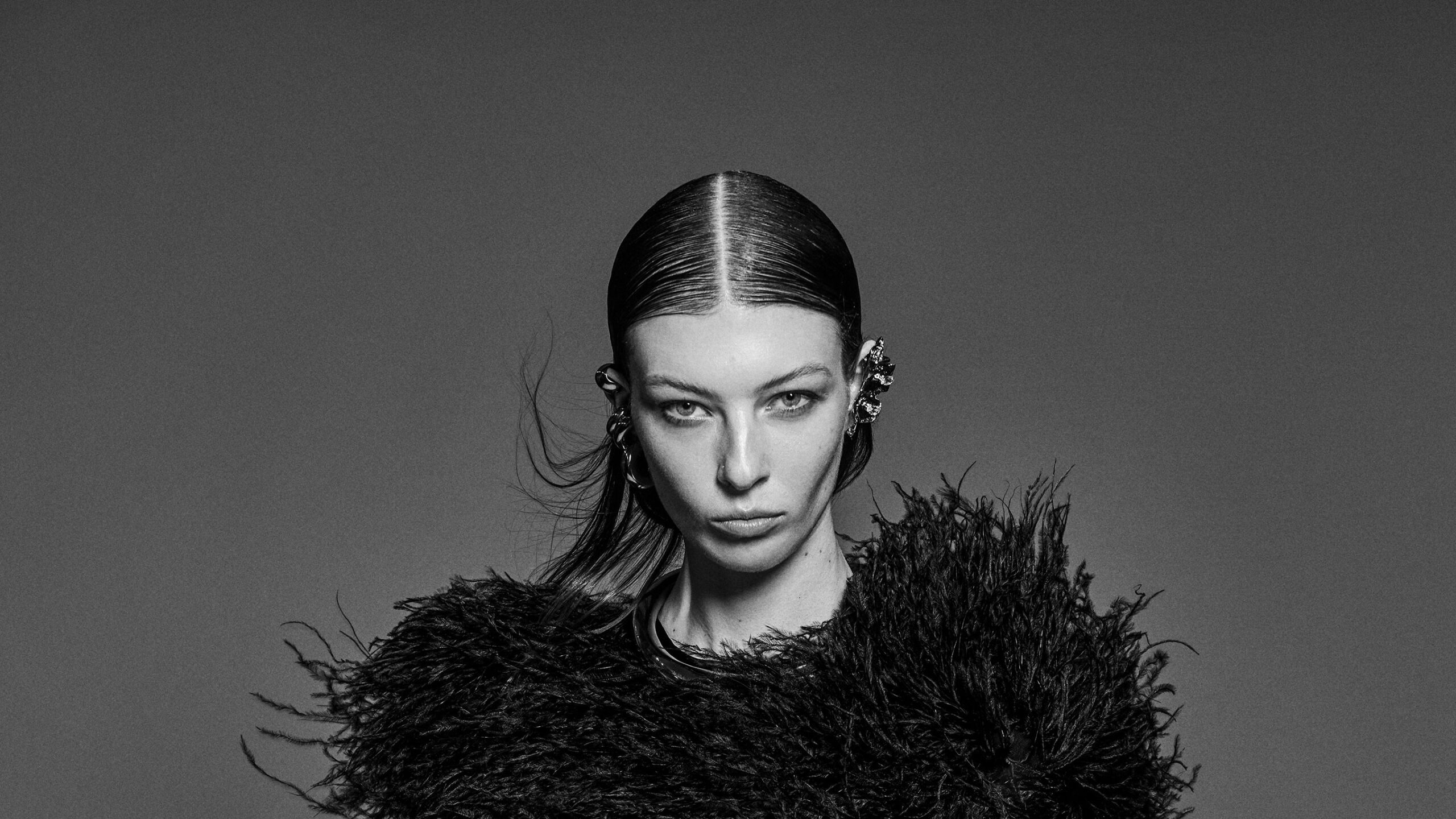 For him, although, it was much less about embracing Americana, and extra about paring again the drama—permitting extra subdued formal apparel to shine with delicate element work. His caftans, which his prospects have been more and more asking for, got here in burgundy with golden accents. His feathered black robe, with a cinched sequined waist, felt extra smooth and extreme. “It has a Mad Max really feel to it—very robust,” stated Khan. A easy black off-the-shoulder velvet column robe, in the meantime, had a beaded bouquet of pink flowers peeking out on the bust—like a shock. “It’s for a lady when she sits on the dinner desk,” stated Khan, who’s at all times considering of gala dressing. “You simply see her shoulders.”