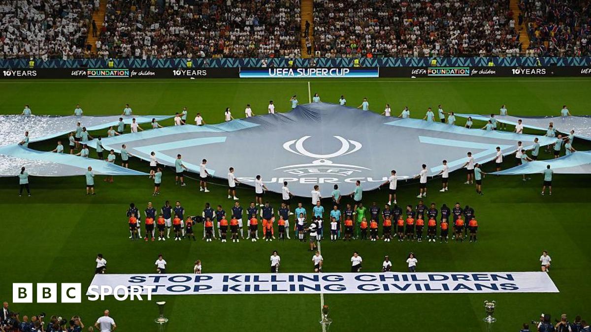 Uefa displays ‘stop killing children – stop killing civilians’ banner before Super Cup final